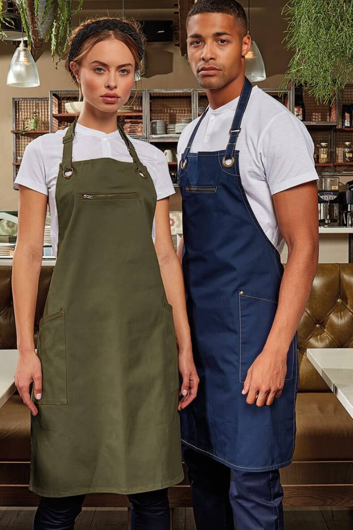 An eco-friendly bib apron, made with a combination of recycled polyester and sustainable cotton. Featuring two handy side pockets with rivet detail. The centre zip pocket comes away to the underside to allow embroidery applications. Contrast stitching features across this apron and oversized antique brass eyelets give an industrial- chic feel to the design.