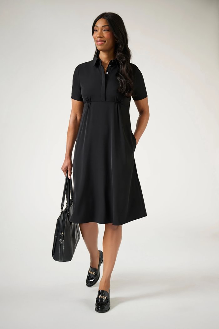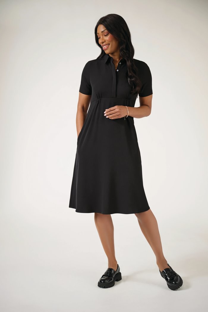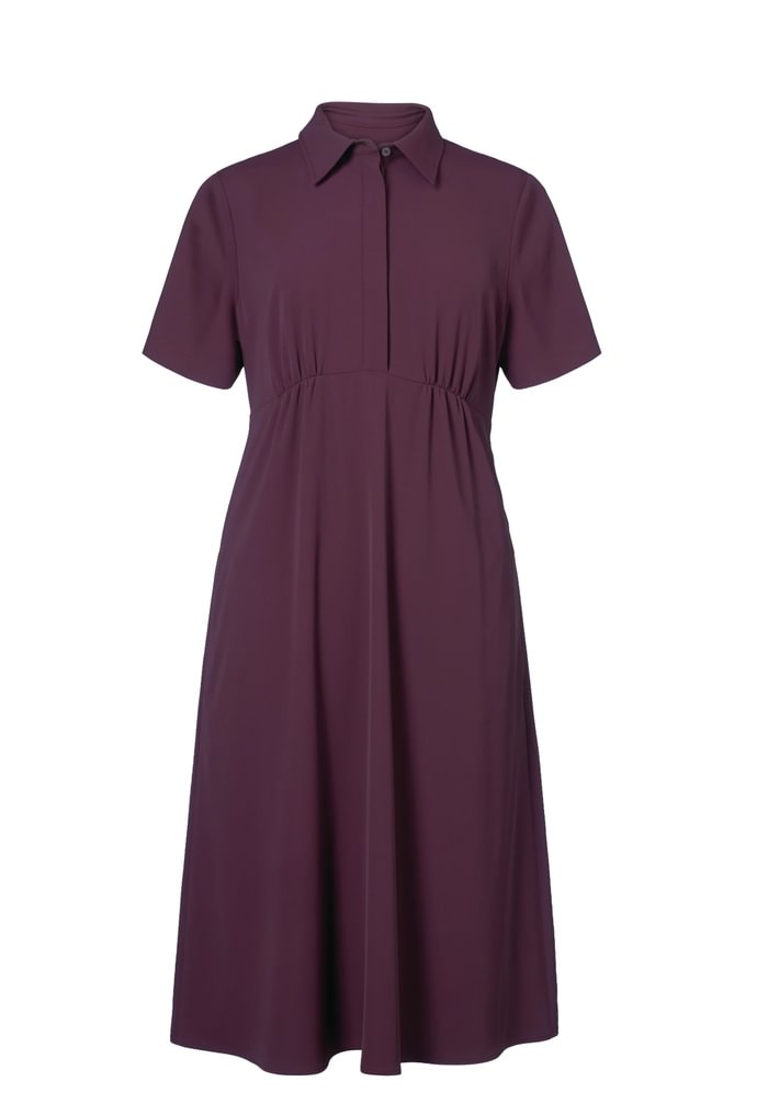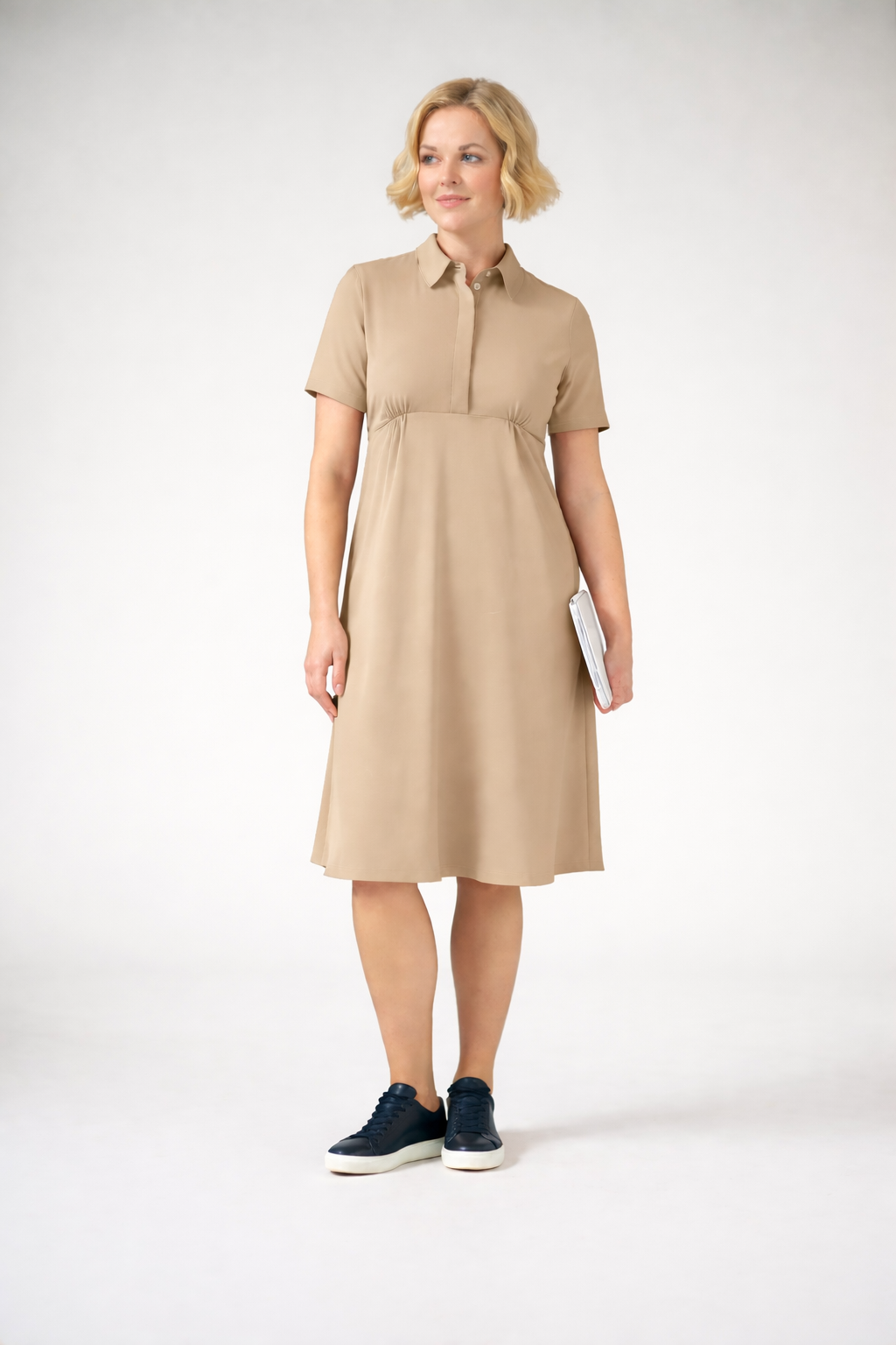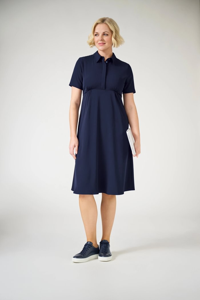 Tyylikäs lyhythihainen paitamekko yhdistää mukavuuden ja modernin siluetin. Mekossa on klassinen kaulus ja kevyesti kellomainen leikkaus. Korotettu vyötärölinja saa mekon laskeutumaan rennosti ja imartelevasti. Käytännölliset sivutaskut edessä lisäävät käyttömukavuutta, ja huomaamaton sivuvetoketju helpottaa mekon pukemista.