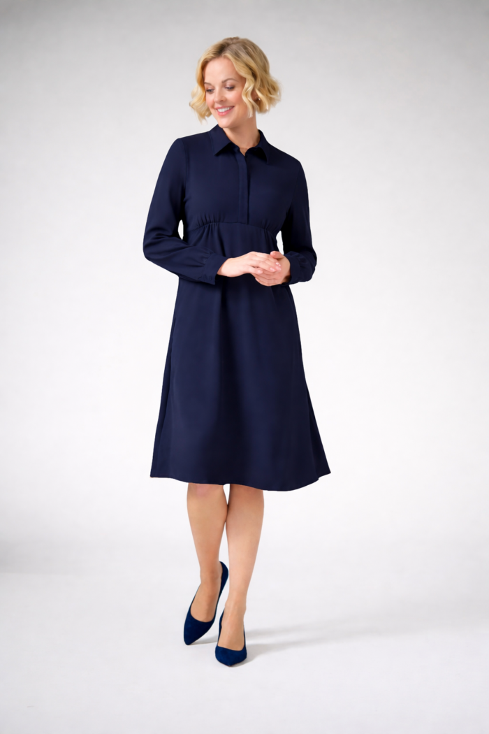 Tyylikäs pitkähihainen paitamekko yhdistää mukavuuden ja modernin siluetin. Mekossa on klassinen kaulus ja kevyesti kellomainen leikkaus. Korotettu vyötärölinja saa mekon laskeutumaan rennosti ja imartelevasti. Käytännölliset sivutaskut edessä lisäävät käyttömukavuutta, ja huomaamaton sivuvetoketju helpottaa mekon pukemista.