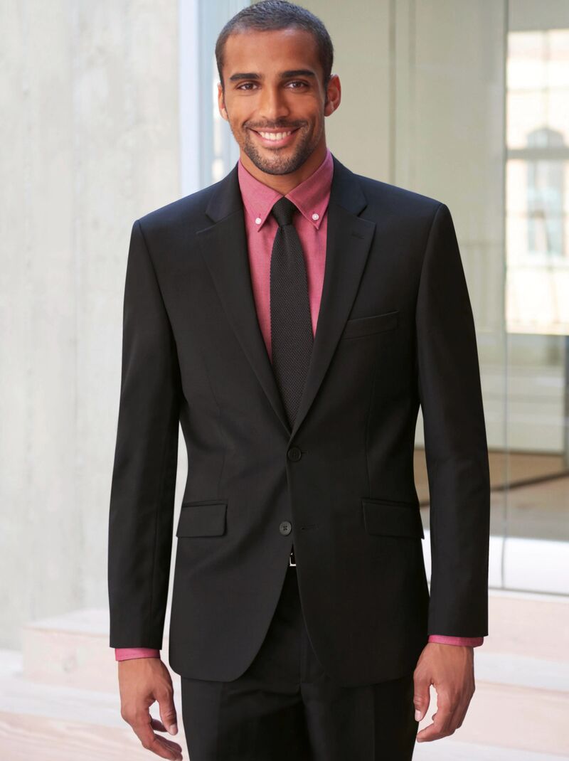 Single breasted tailored fit jacket, 2 button front, side vents, slim lapels with saddle stitching, piano faced interior with slim pocket jets.