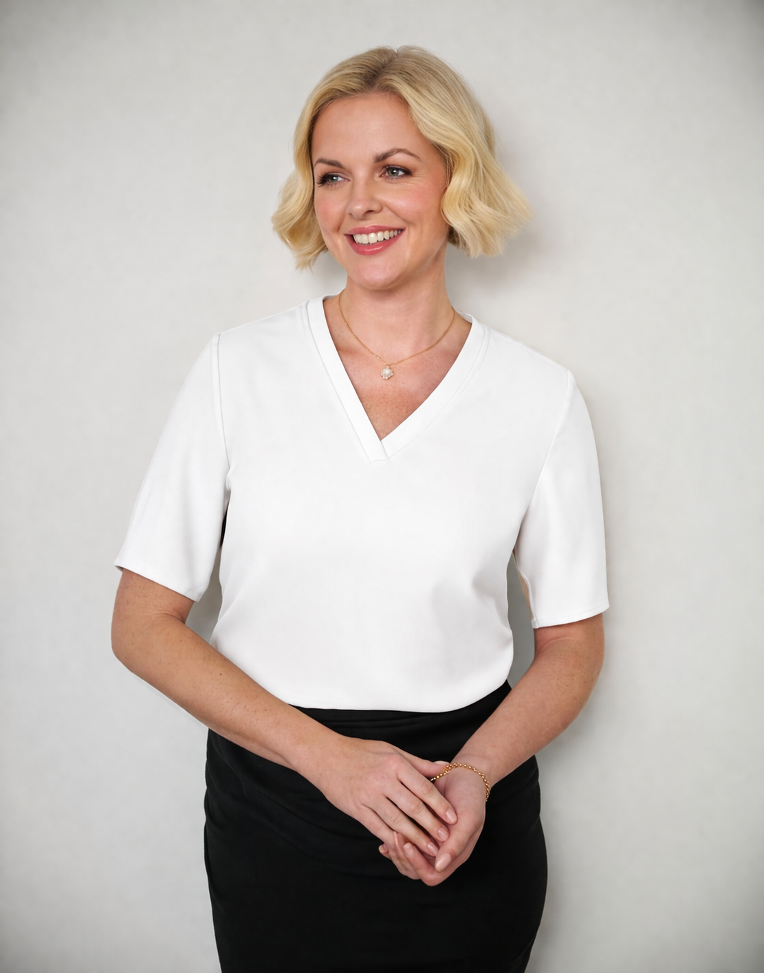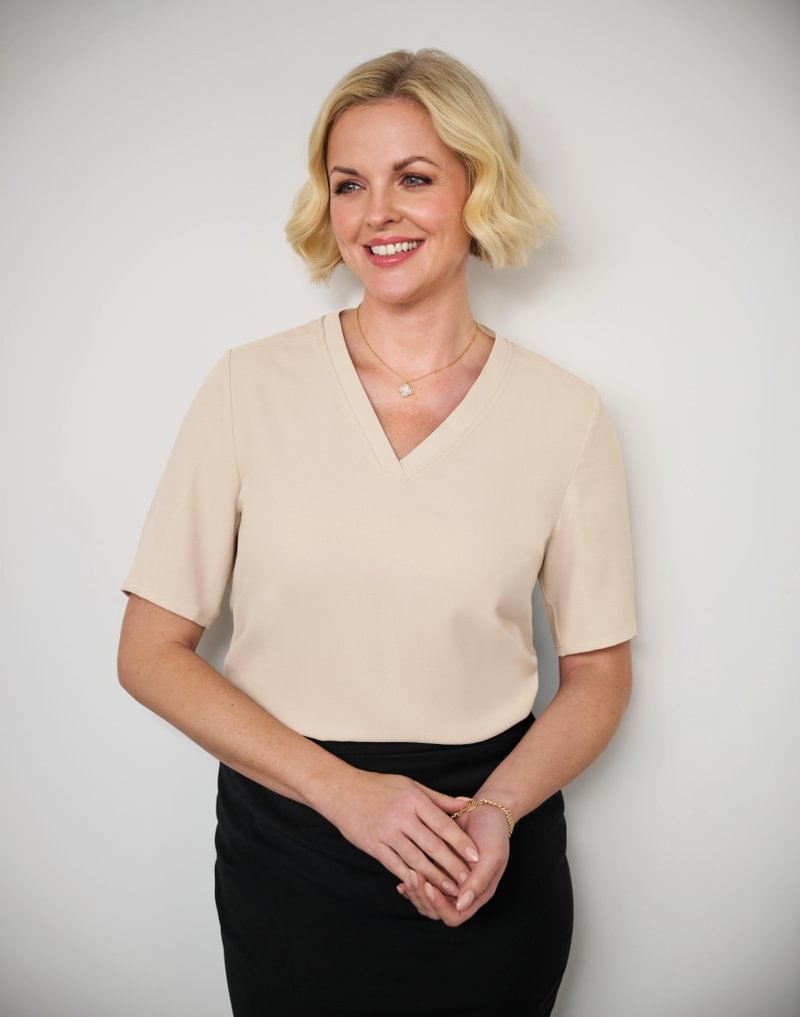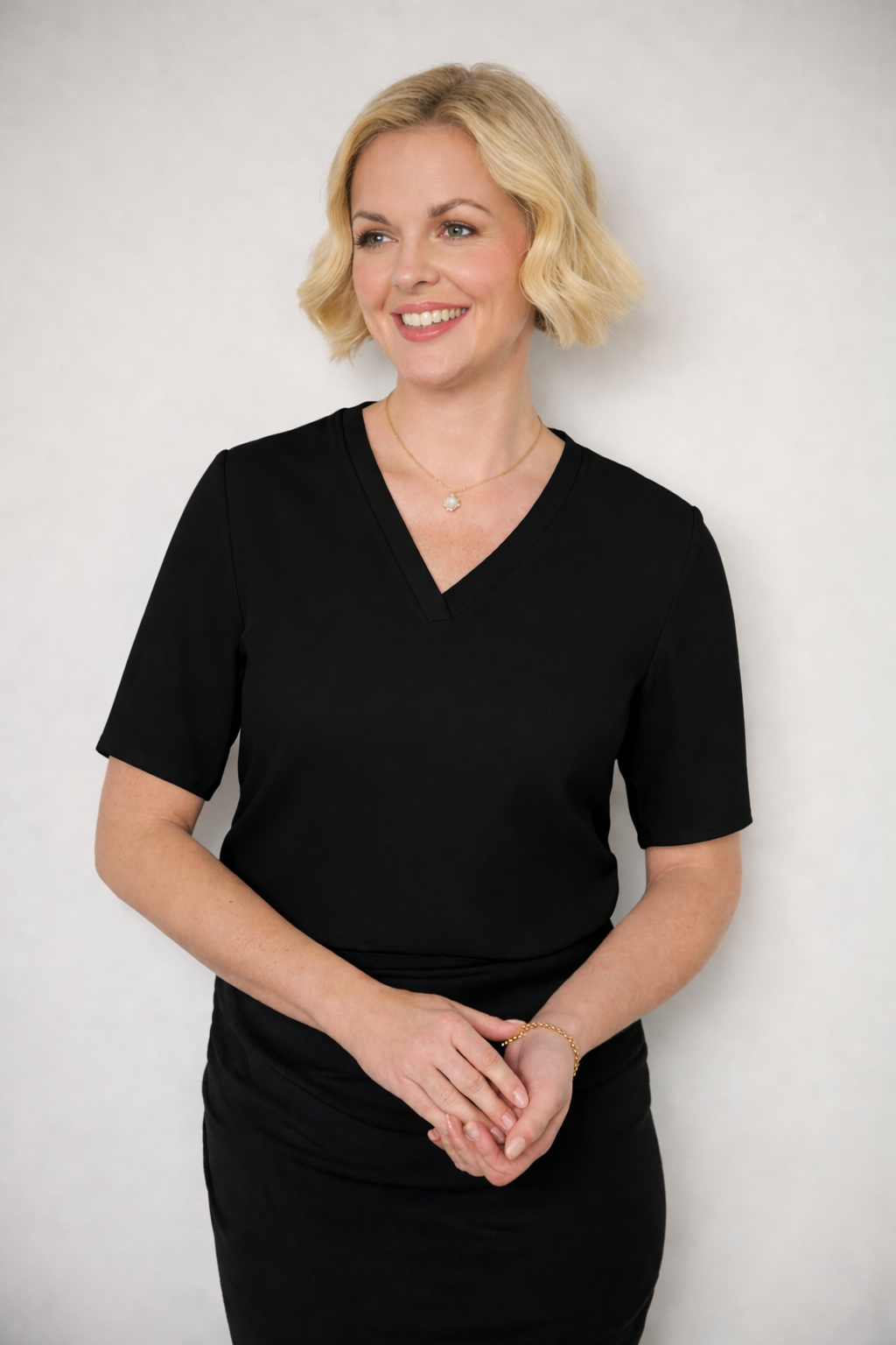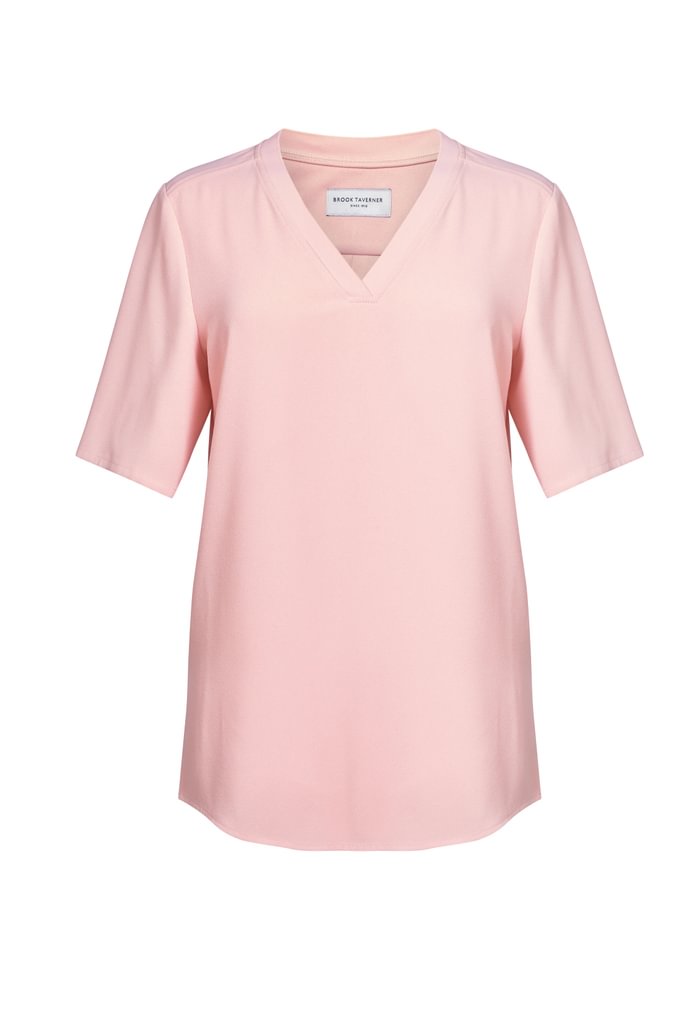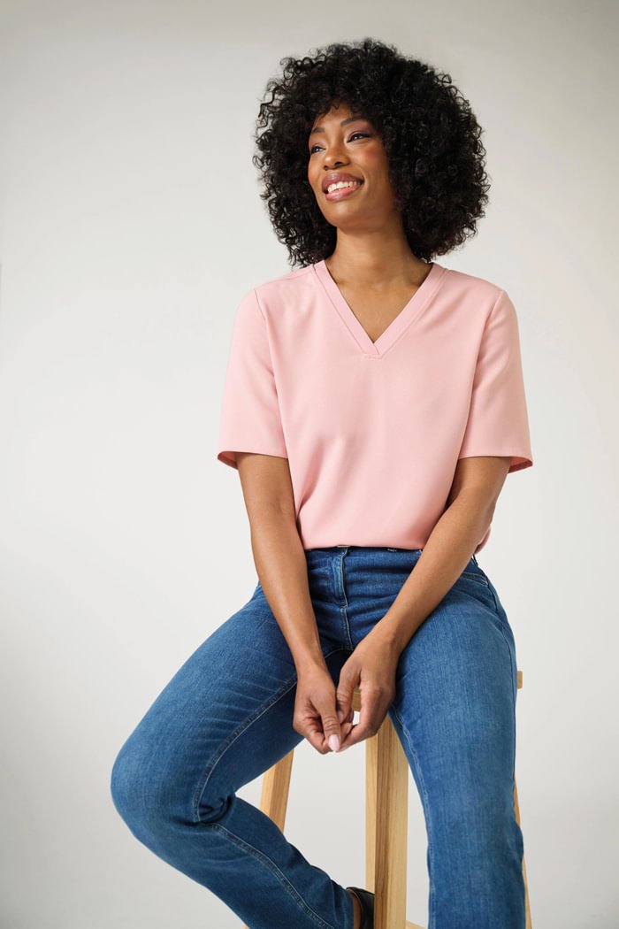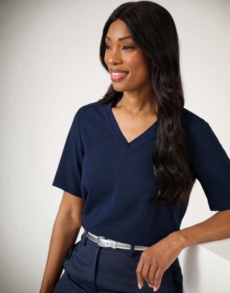 Tämä naisten V-aukkoinen T-paita on elegantti lisä työvaatekaappiisi. Kevyestä, helppohoitoisesta kankaasta valmistettu T-paitapusero pitää sinut ammattimaisena koko päivän.