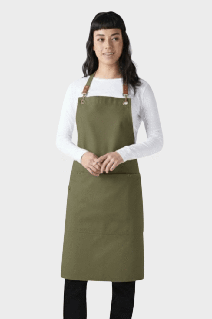 Skaisti veidots priekšauts ar smalkām dizaina detaļām. Priekšauta auklas augšdaļa ir nostiprināta ar ādas akcentiem un metāla klipšiem, kas piestiprinās pie metāla cilpām. Priekšauta auklas ir krustām šķērsām pārvilktas pāri mugurai, izvilktas caur jostas cilpām un eleganti sasienamas aizmugurē. Priekšauta galvenajā daļā ir trīs lieli ar kniedēm nostiprināti kabatas, kā arī ir mazāka kabata zīmuļa glabāšanai. Kokvilnas un pārstrādāta poliestera auduma maisījums piešķir šim klipšu priekšautam izturību, formu un patīkamu mīkstuma sajūtu.