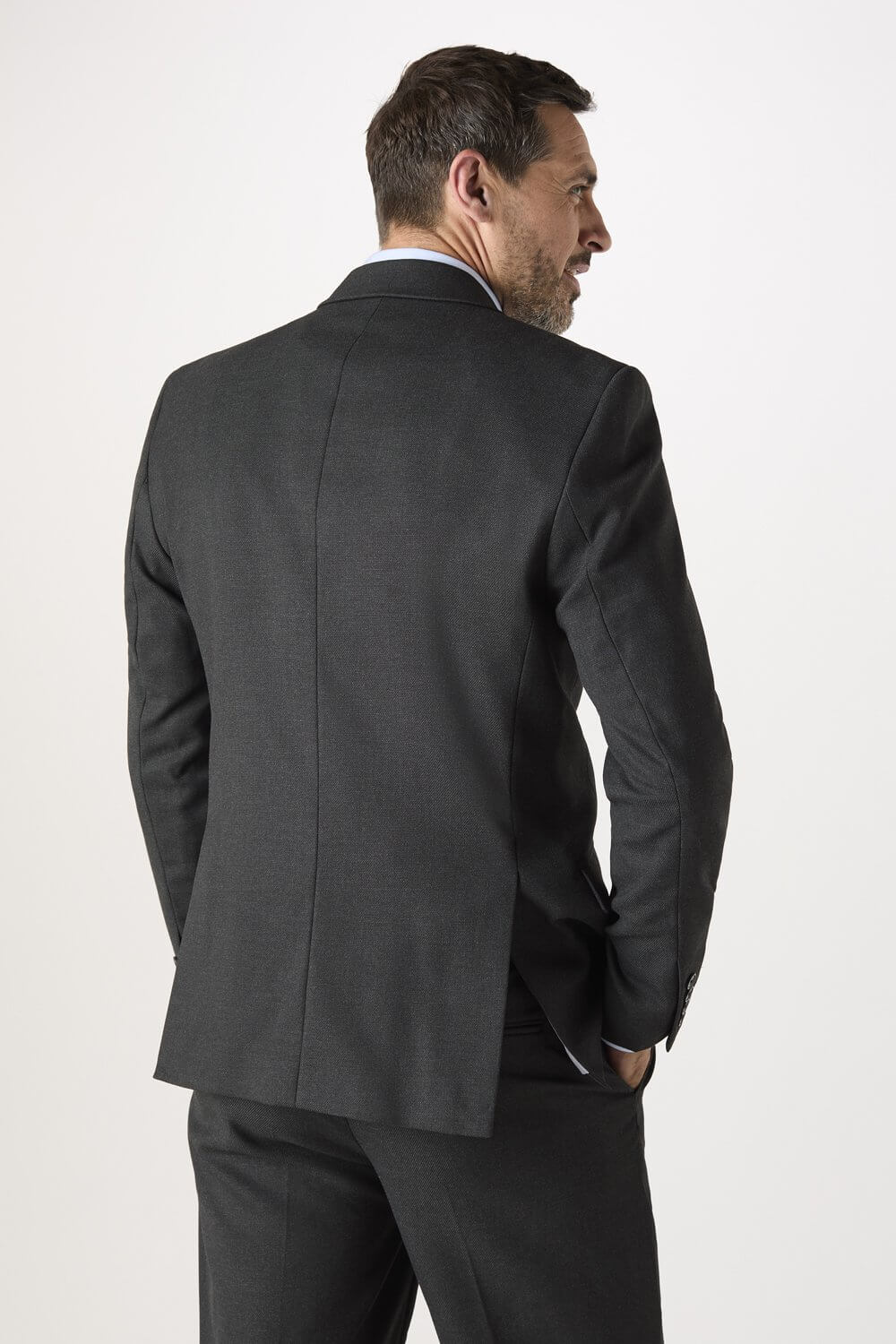 This Men’s Modern Fit Jacket has a shorter length with narrow lapels than our other suiting styles; as well as tapered sleeves that give this jacket a streamlined contemporary look.