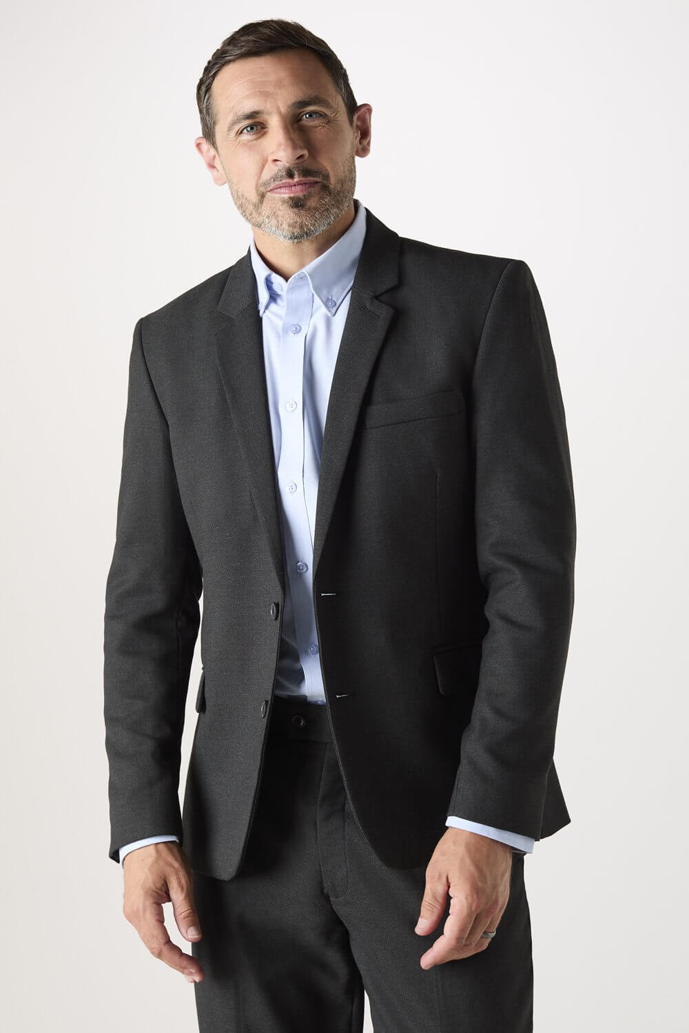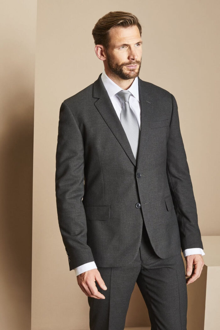 This Men’s Modern Fit Jacket has a shorter length with narrow lapels than our other suiting styles; as well as tapered sleeves that give this jacket a streamlined contemporary look.