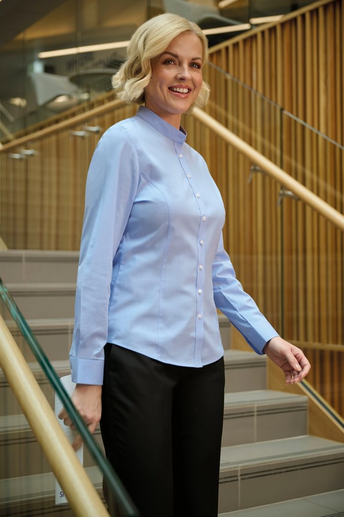 Smart casual blouse with mandarin collar, a great choice to workwear collection. Slightly stretchy, princess-cut, long-sleeved blouse. Tested durable fabric!