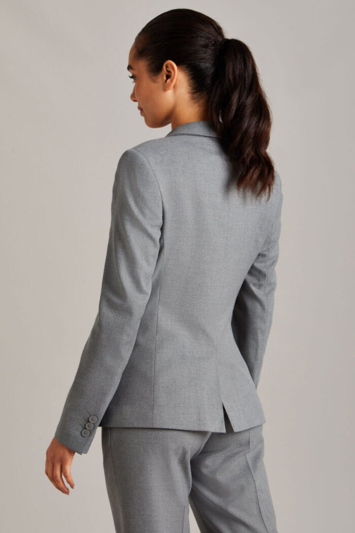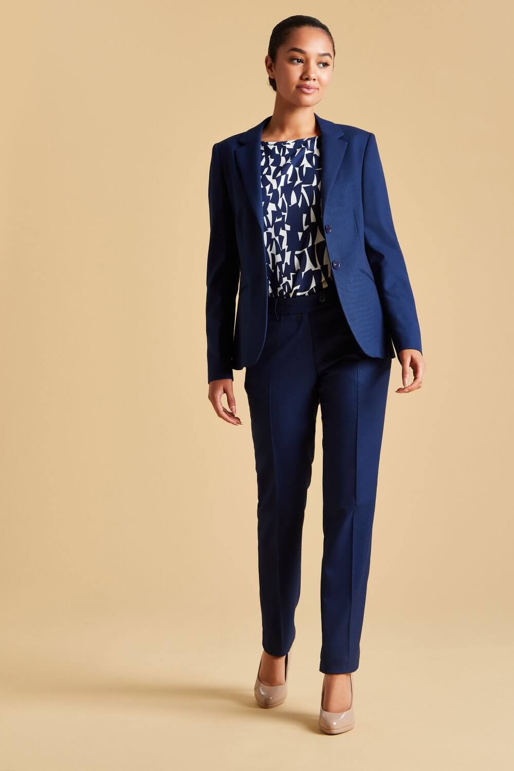 Modernse lõikega, eest kahe nööbiga naiste pintsak, avatud krae, sirgete varrukate ja sissetöödeldud taskuga. Varrukatel kolm ilunööpi. Väga lihtne hooldada, plekke hülgava teflon kattega.