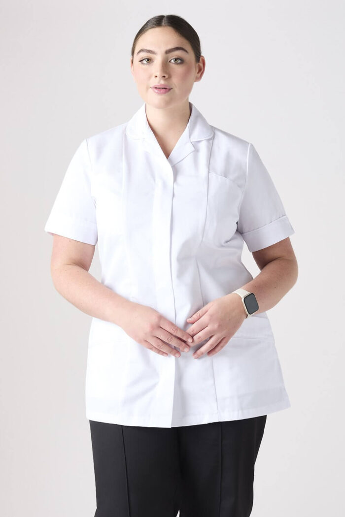 Meditsiinitöötajate klassikaline valge tuunika nakkuskindlast kangast.